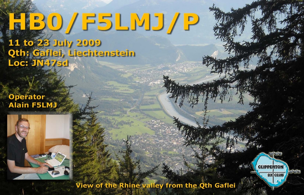 Juillet 2009, vacances en famille au Liechtenstein et en Suisse pour deux semaines. Le QTH était situé au Liechtenstein, à Gaflei sur les hauteurs de Vaduz, dominant la vallée du Rhin : 1036 QSO réalisés, trafic uniquement le soir et tôt le matin, partagé entre CW (47 %), Modes Digitaux (35%) et Phonie (18 %).